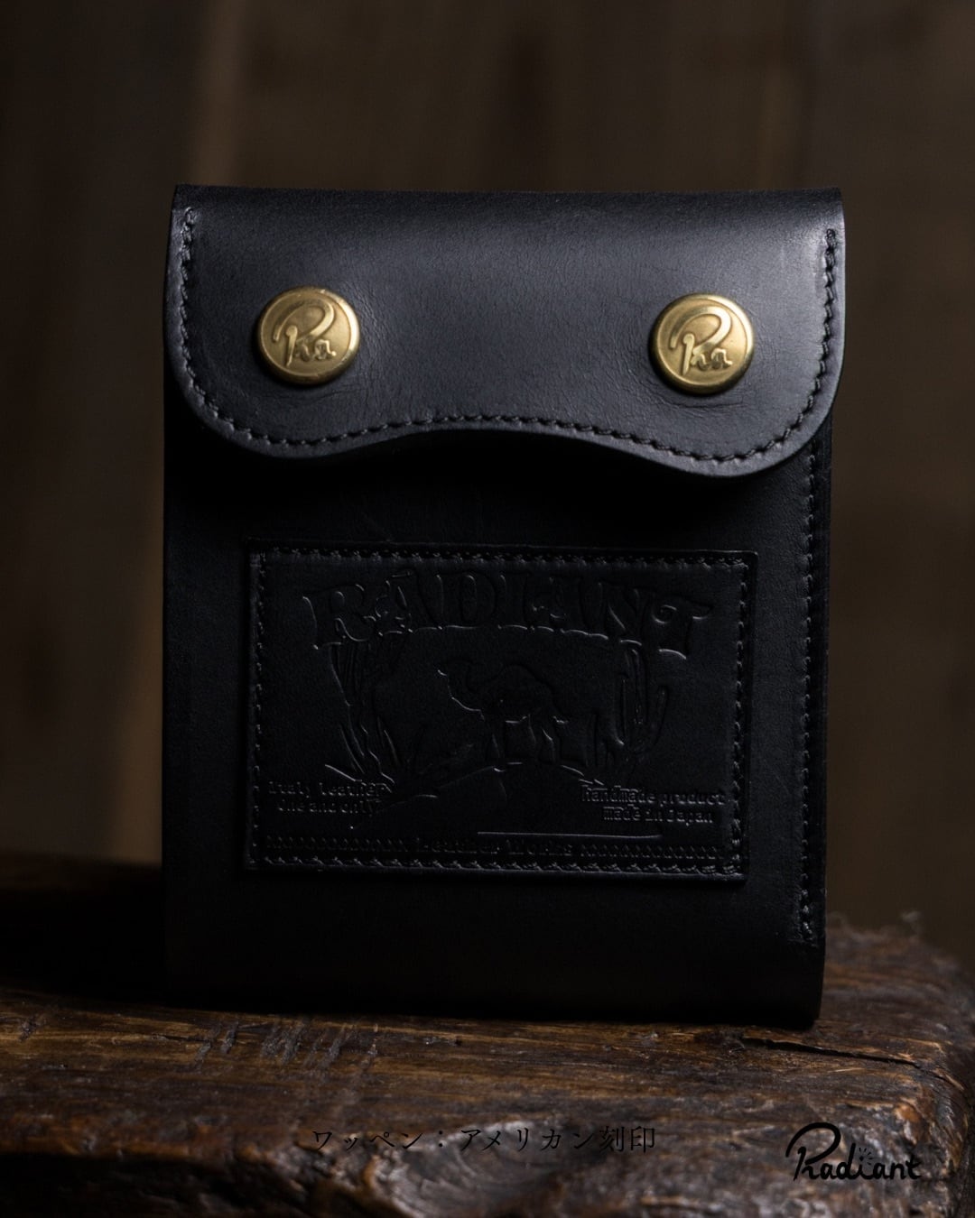 「革らしさ」を残すために外装にはあえて厚みのある革を使っています。手にした際はしっかりとした革の重みを感じられると思います。本体蓋にはradiantオリジナルの「Rボタン」が標準装備となります。