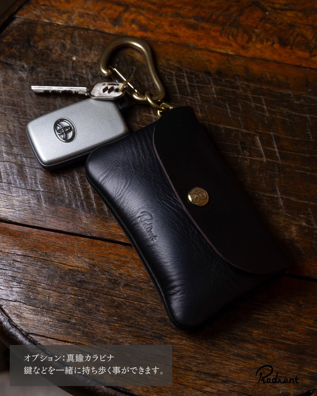 オプションで「カラビナ」、「チェーン」を取り付ける事で鍵とセット持ち歩く事が可能です。
